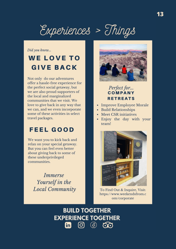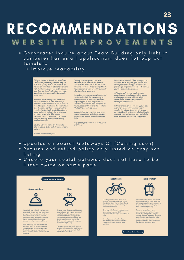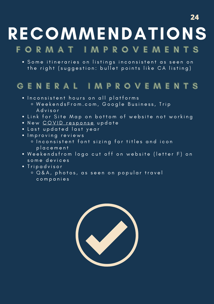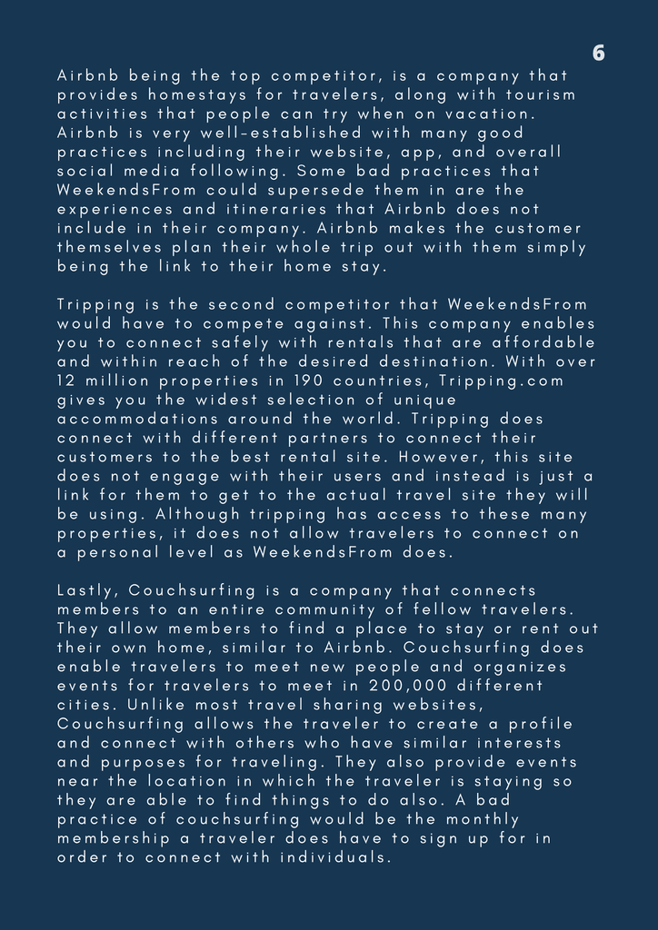 My favorite initiatives I pushed to see through in the very end included converting a B2C business model into a B2B business model, as what WeekendsFrom could play into team-bonding activities and wellness initiatives for companies. The second initiative that I initially threw out there were the Spotify playlists, but after thinking through the psychology behind it, it allowed the decision to create them justified.