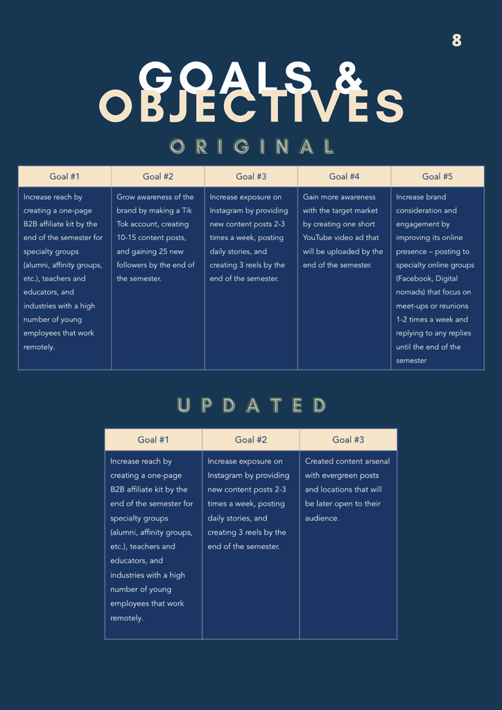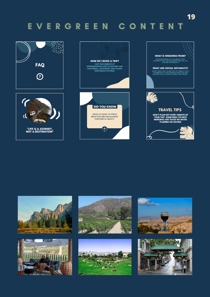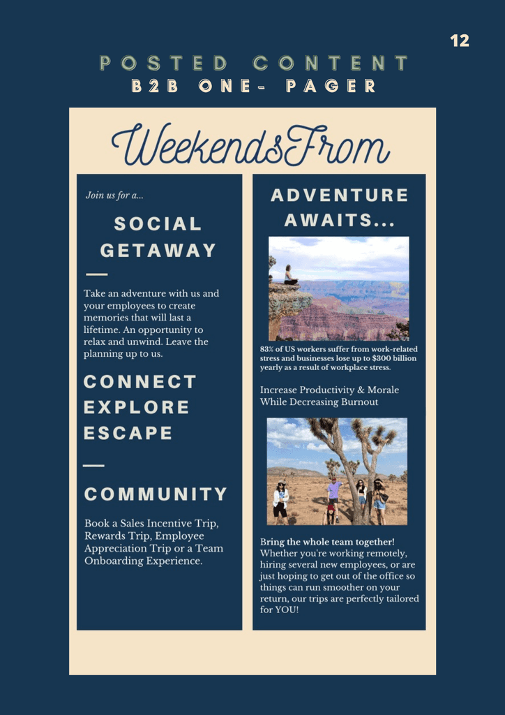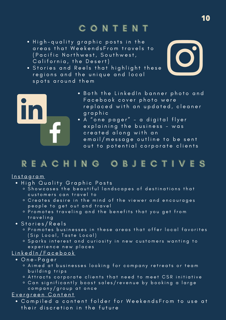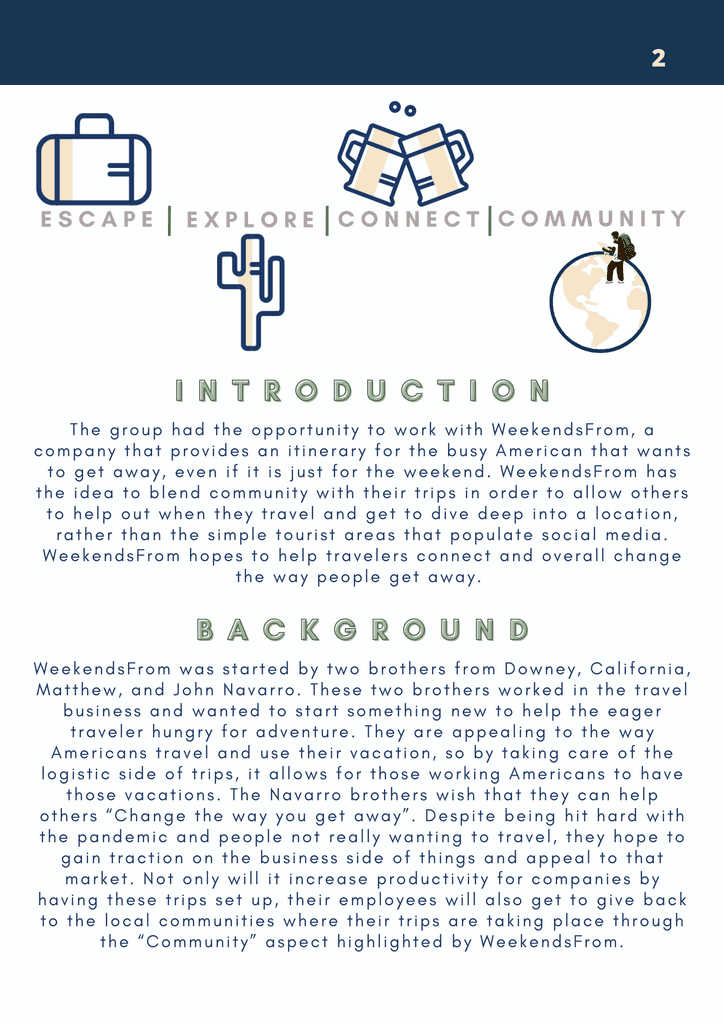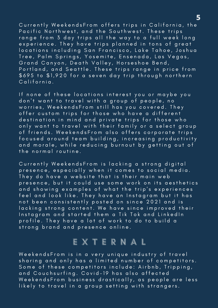 WeekendsFrom is a travel-planning service company started by the Navarro brothers. Both had a passion for the industry and it can show through this passion project of their own. During my last semester in college, I took on the Project Manager role and lead my small but mighty team of content and strategy managers to leave the brothers with a content arsenal equipped with evergreen content, a posting schedule to follow, playlists that align with the trips offered on their site, as well as a newly created Tik Tok account to allow them to gain traction on a new platform. Below is the group's Marketing Plan that I compiled to help showcase not only how we saw the brand, but how it can be presented to others.